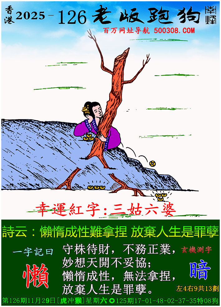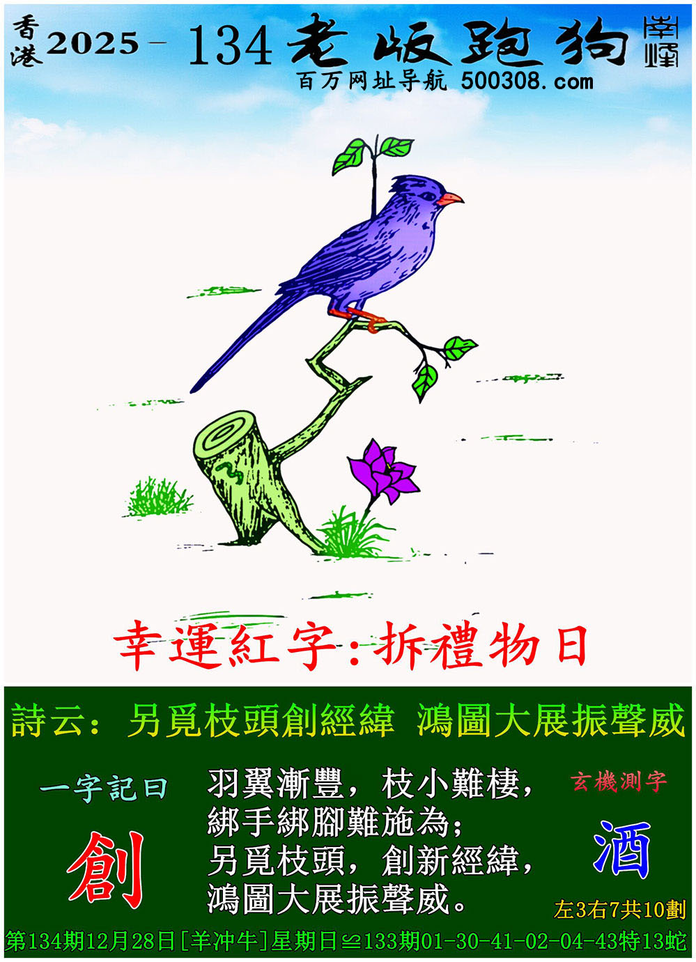 134期跑狗图:一字記之曰:【哺】 逢下蔭涼,母側雛藏。 啄蟲哺飼,咕咕輕喚。 玄機測字:《純》一語中特:九死一生